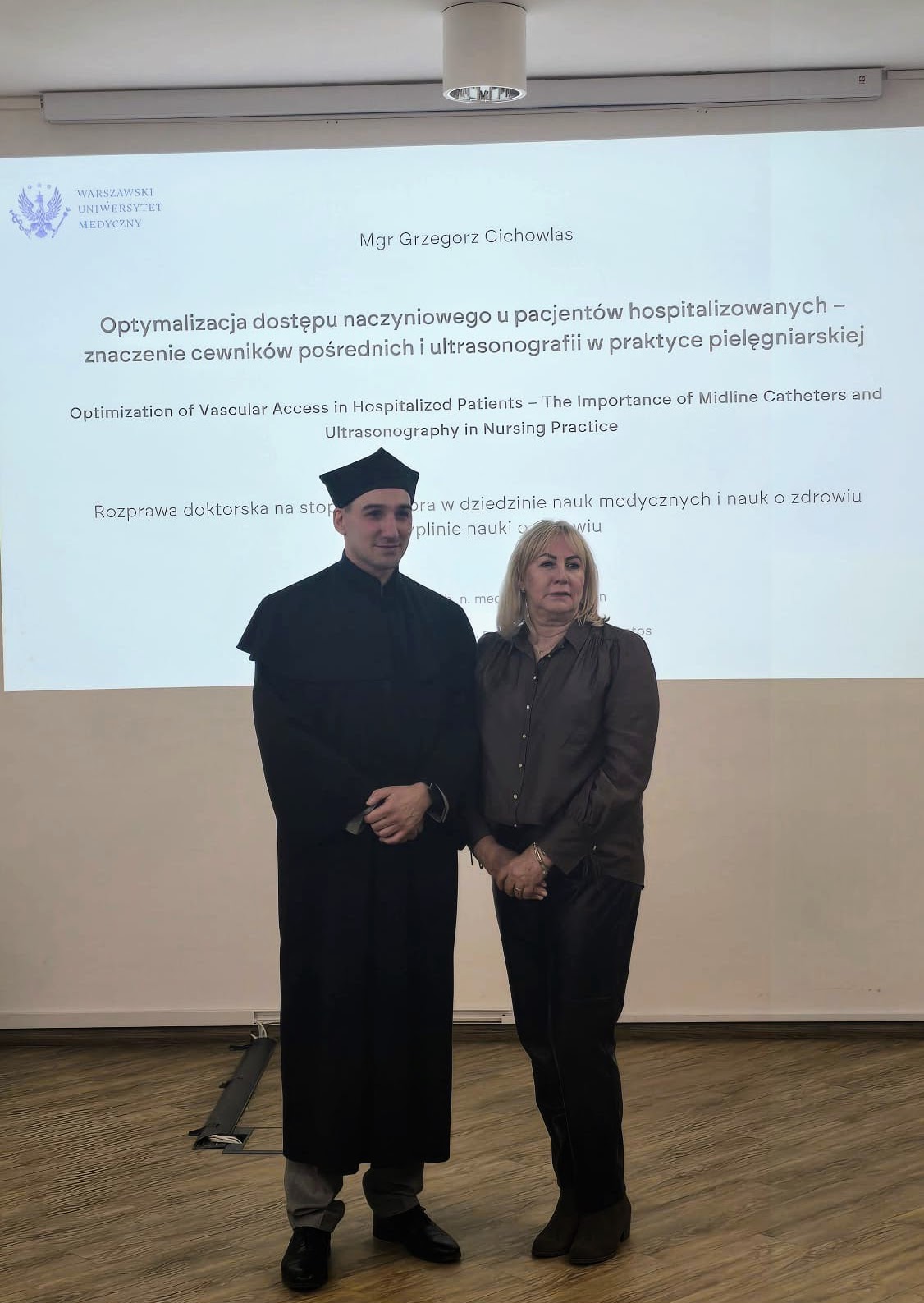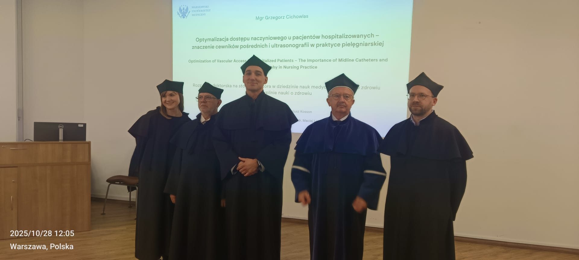 Podczas obrony towarzyszyły mu Pani Iwona Stańczuk – Naczelna Pielęgniarka Szpitala Czerniakowskiego oraz Pani Wioletta Słomka – Koordynator Świadczeń Pielęgniarskich, wspierając go w tym ważnym momencie zawodowym.